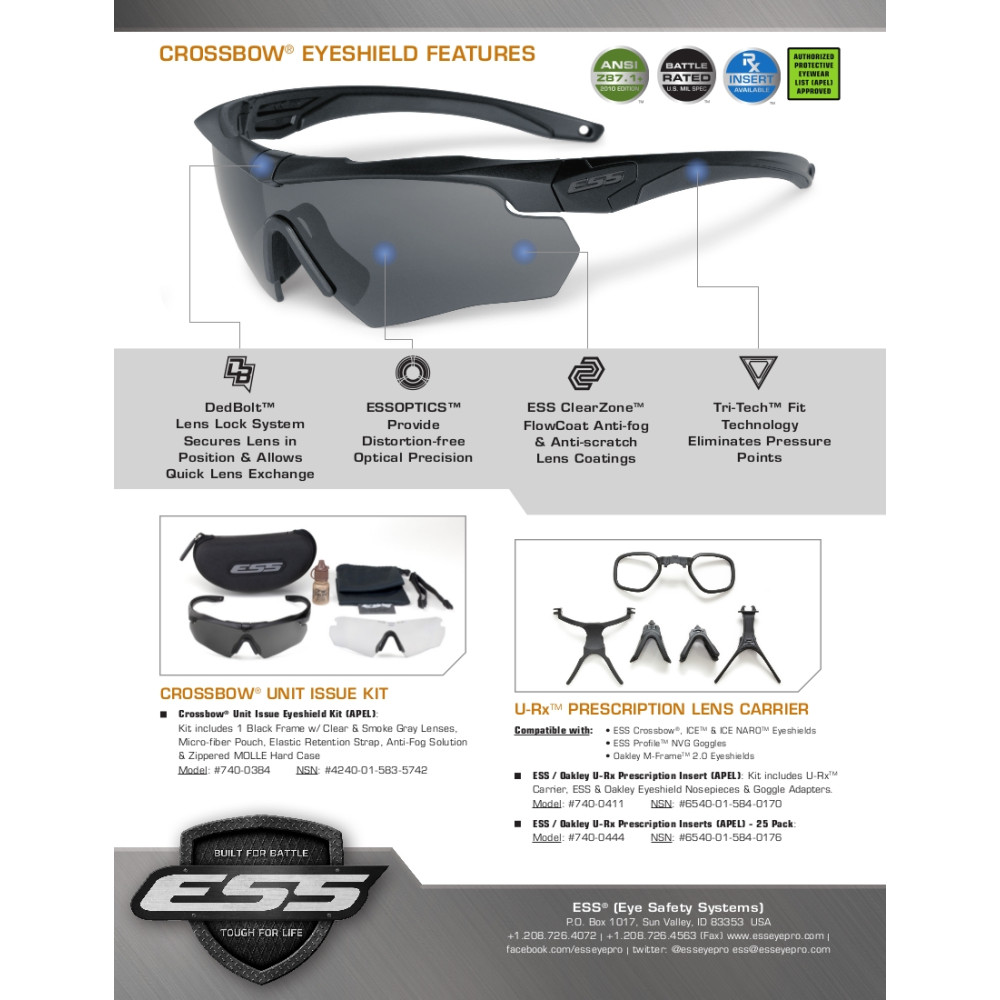 Як частина платформи окулярів ESS Cross-Series™, всі компоненти Crossbow® сумісні та повністю взаємозамінні з ESS Crosshair™ та ESS Suppressor™. Наприклад, ви можете оновити Crosshair™ до преміальних протитуманних лінз Crossbow®, у тому числі поляризованих із рейтингом ANSI, або адаптувати їх для захисту органів слуху за допомогою ультратонкої оправи Suppressor™.