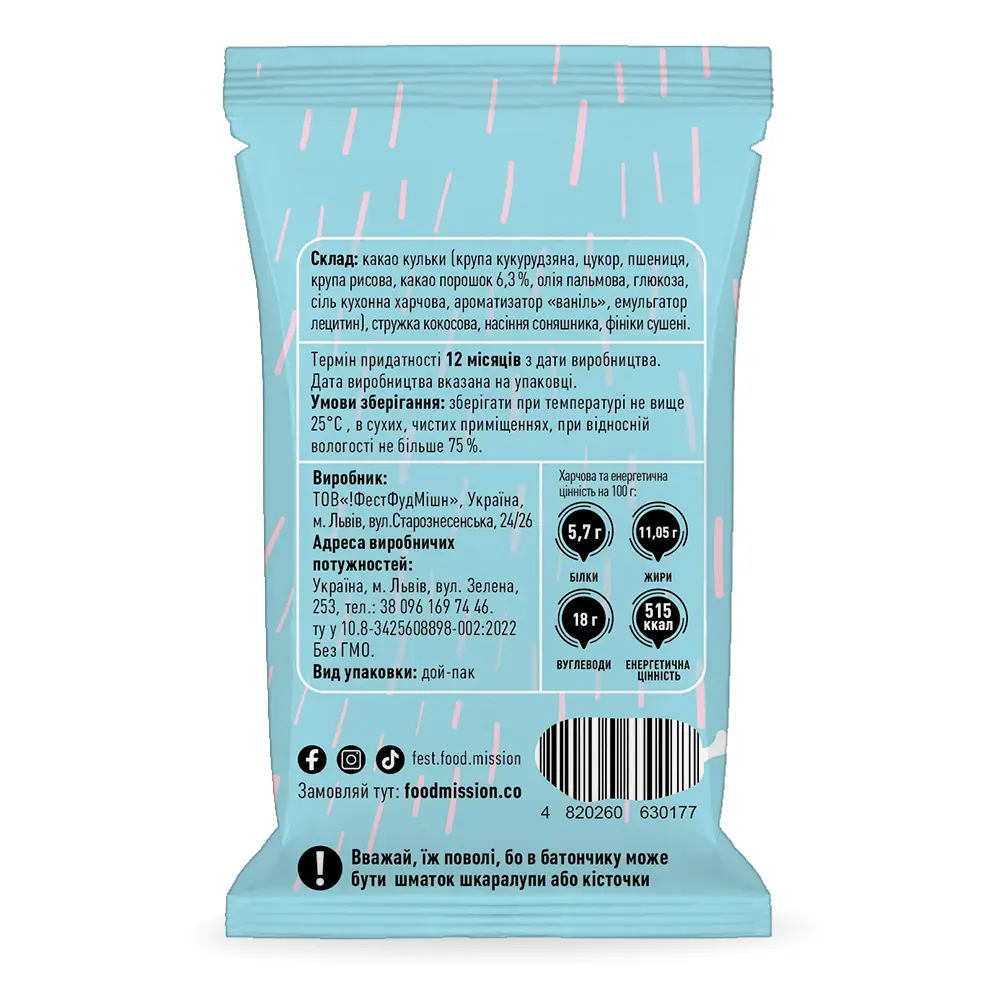 Склад: шоколадні кульки, стружка кокосова, насіння соняха, фініки сушені.