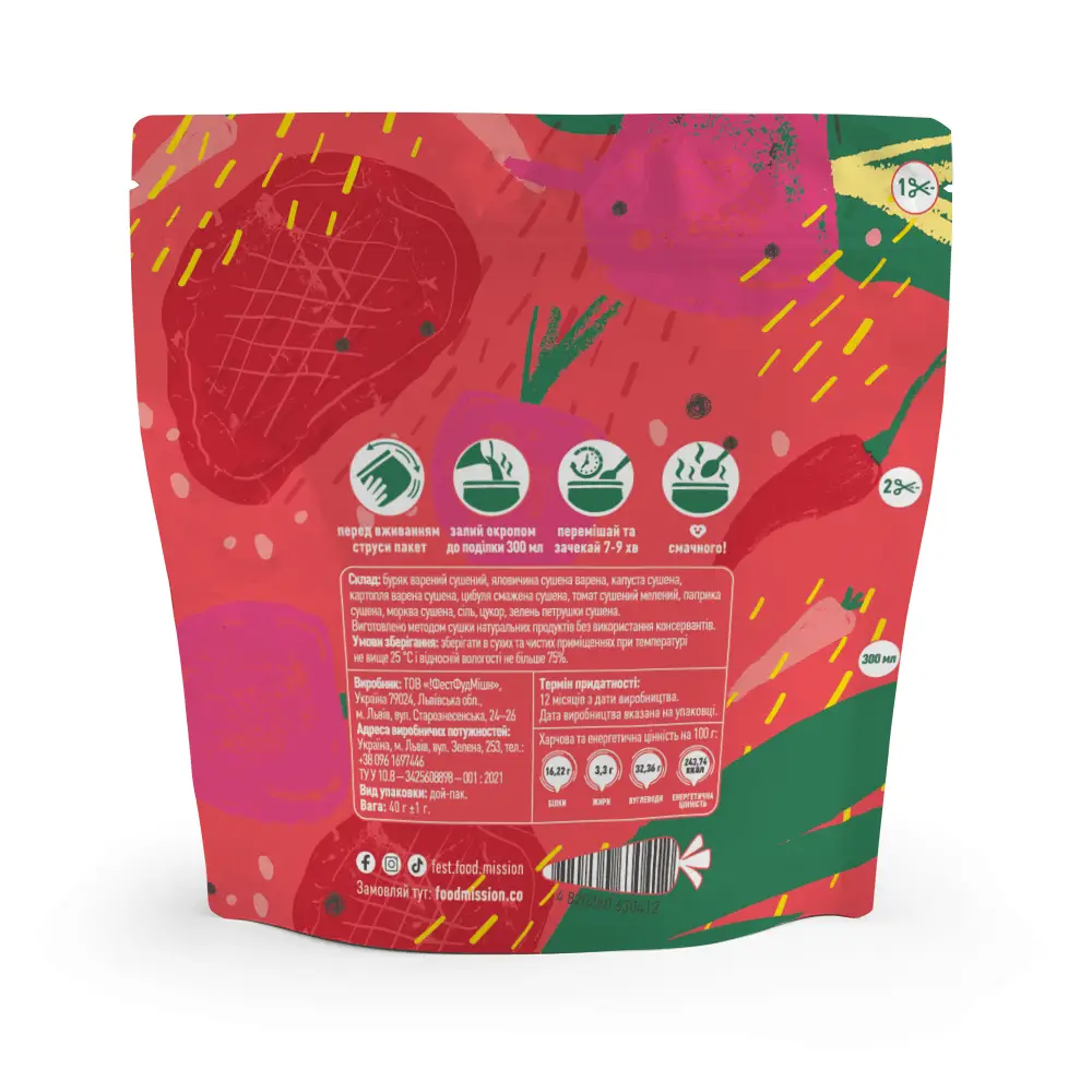 Склад: буряк варений сушений, яловичина сушена варена, капуста сушена, картопля варена сушена, цибуля смажена сушена, томат сушений мелений, паприка сушена, морква сушена, сіль, цукор, зелень петрушки сушена.