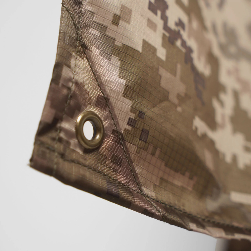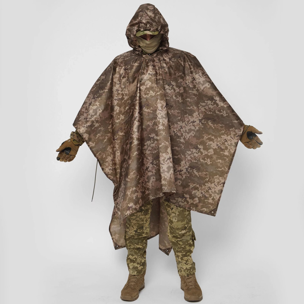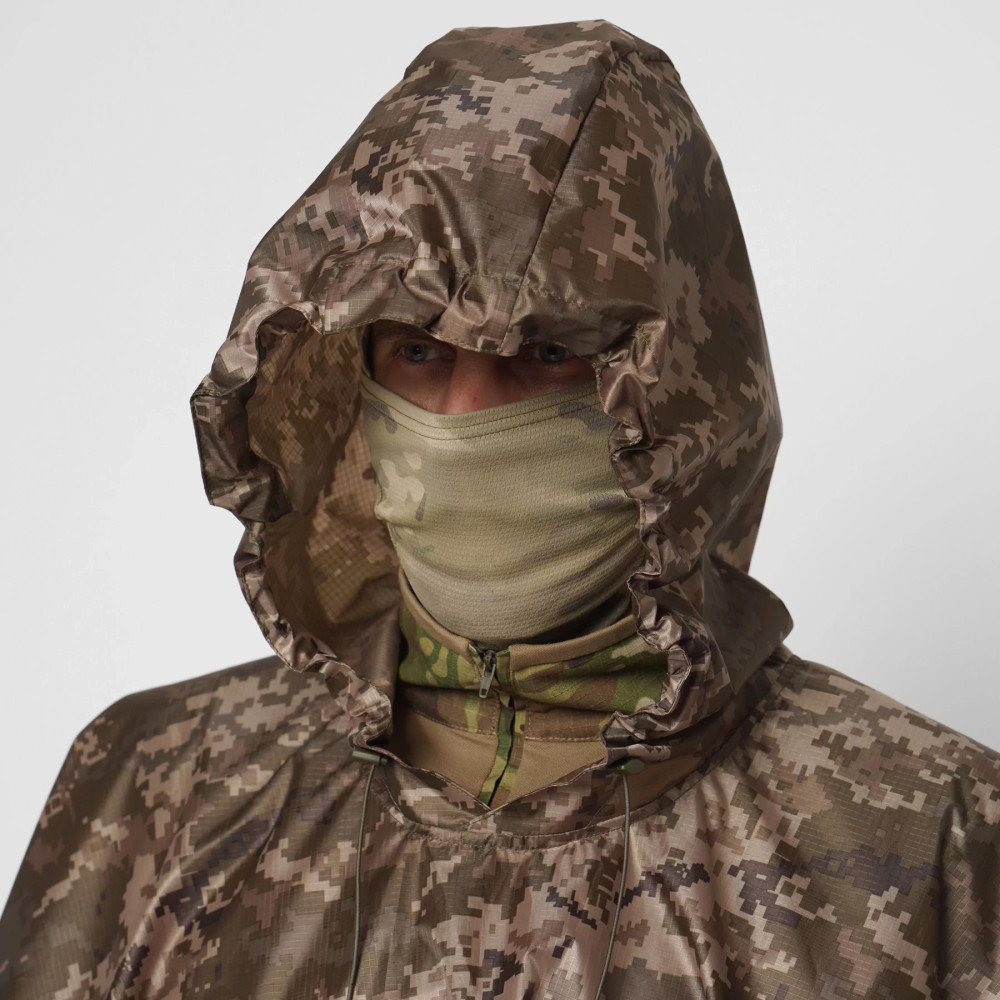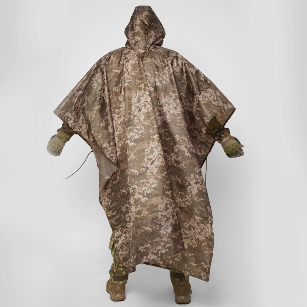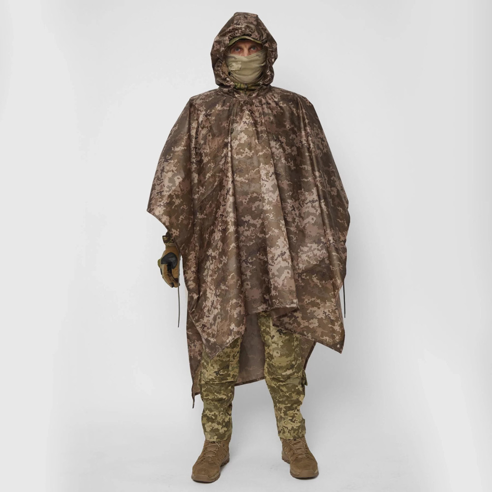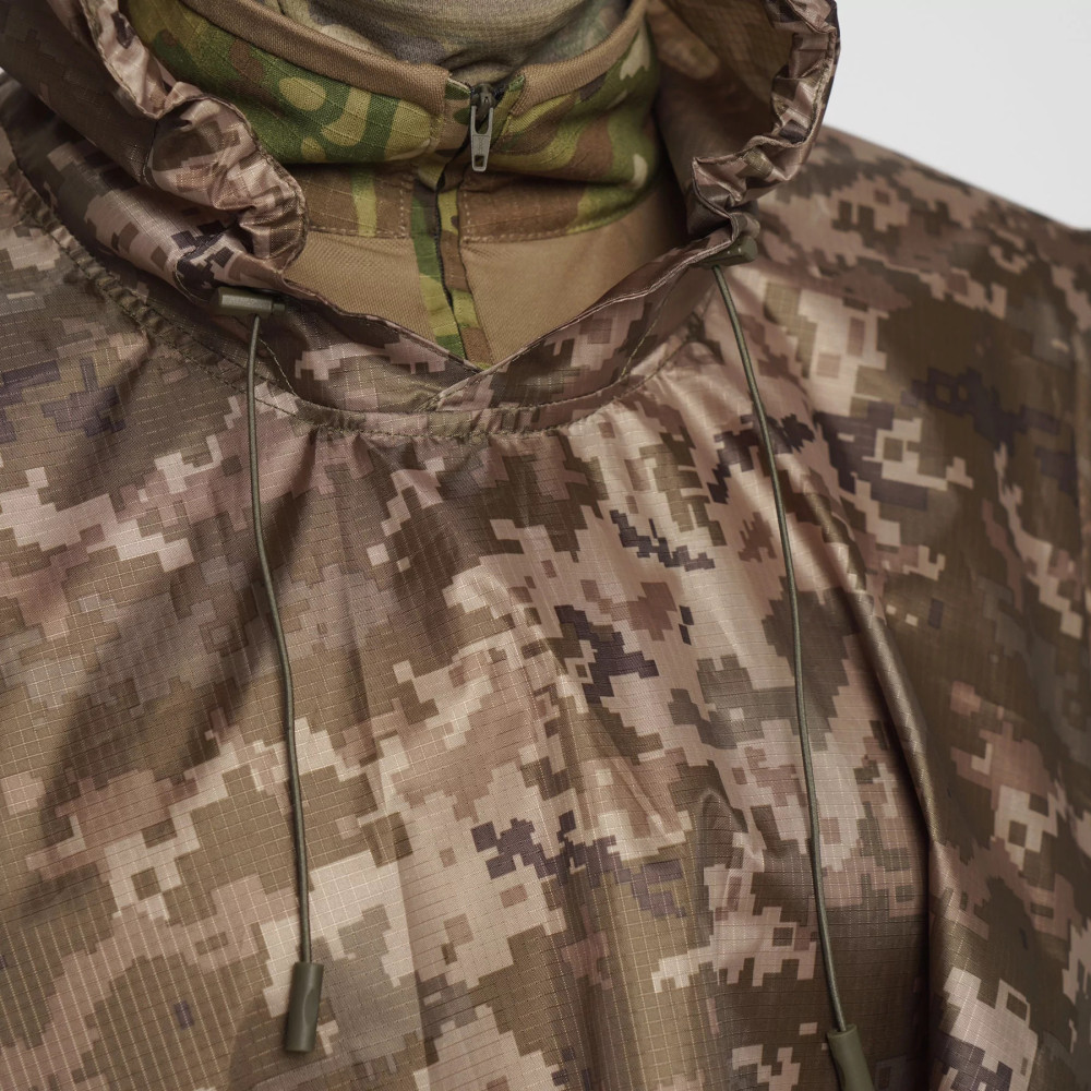 Дощовик пончо-намет від UATAC виготовлений з тканини 100% поліестер міні ріп-стоп піксель з покриттям PU 2000 мм. Дощовик є ідеальним вибором для тих, хто шукає надійний та функціональний захист від погодних умов. Ця плащова тканина має водонепроникне покриття, що забезпечує надійний захист від дощу, вологи та вітру. Це дозволяє залишатись сухим та захищеним від вітру в будь-яких погодних умовах.