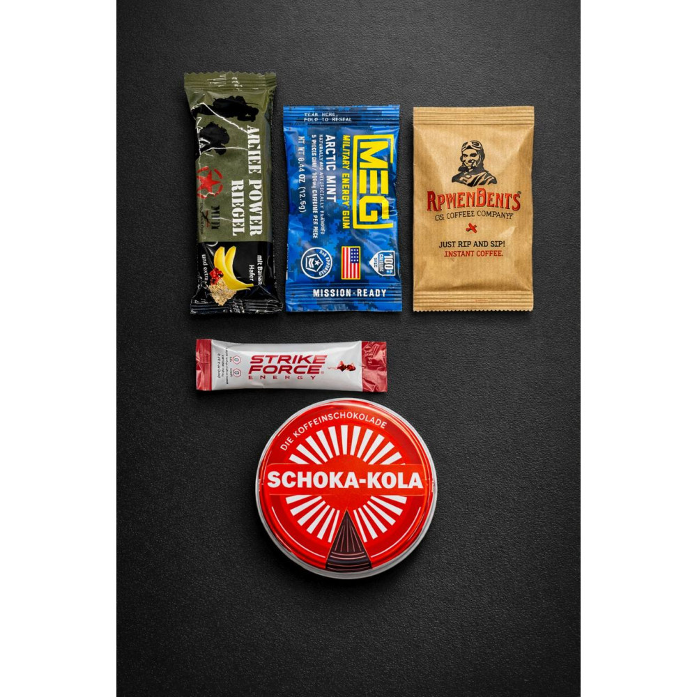 До складу набору входять різні формати джерел кофеїну та швидких вуглеводів: шоколад, енергетичний батончик, жувальна гумка та розчинна кава. Таке поєднання дозволяє використовувати набір гнучко — отримати миттєвий ефект або підтримувати рівень енергії протягом тривалого часу.