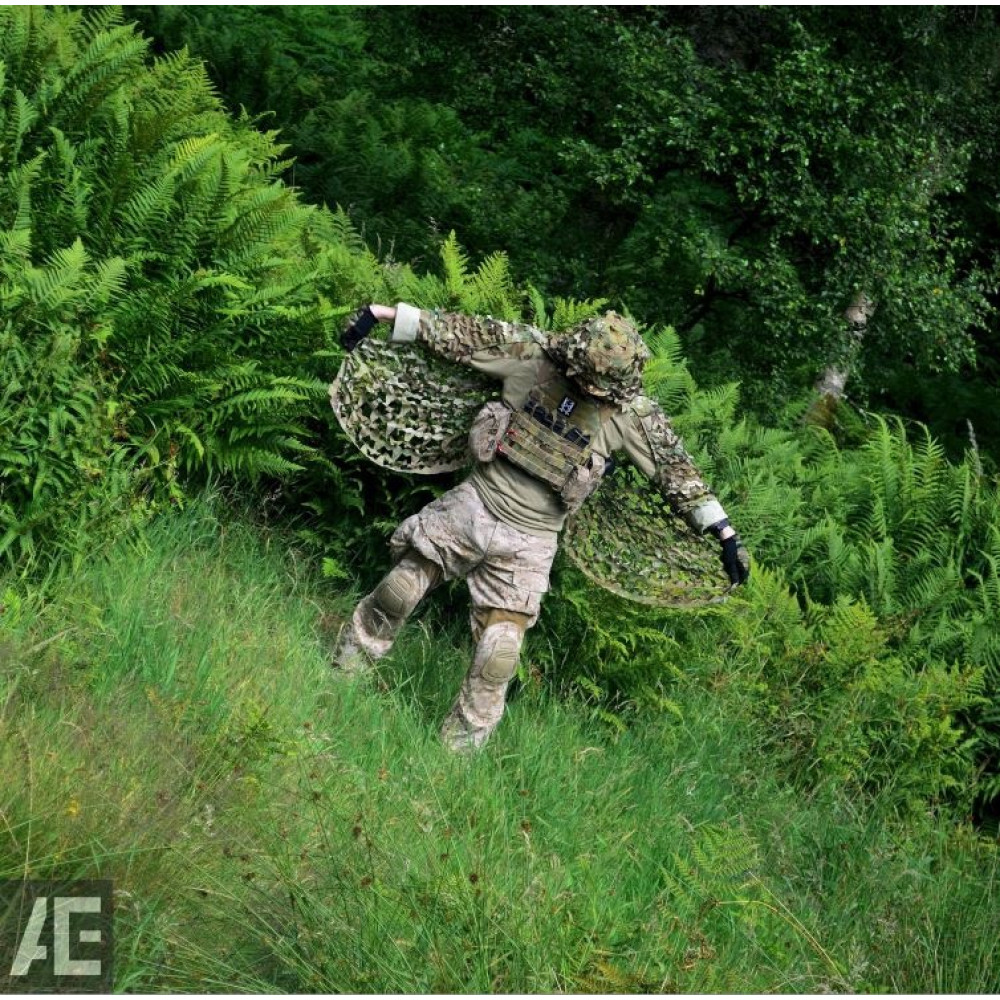 Подвійна задня панель маскувальної накидки може використовуватися для маскування стрілка разом із гвинтівкою або іншим габаритним обладнанням.