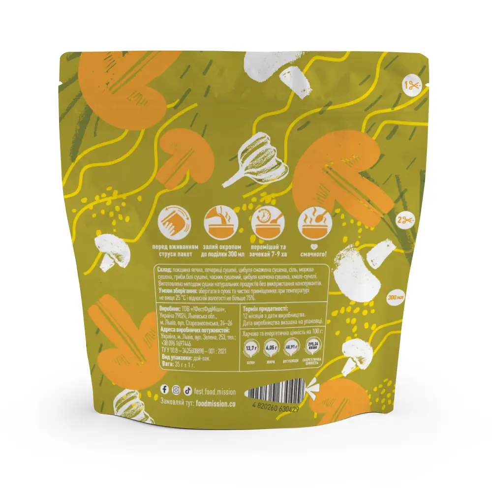 Спосіб приготування: перед вживанням струсити пакет, відкрити та залити страву окропом до поділки 300 мл, ретельно перемішати, закрити замок на пакеті та зачекати протягом 7-9 хвилин.