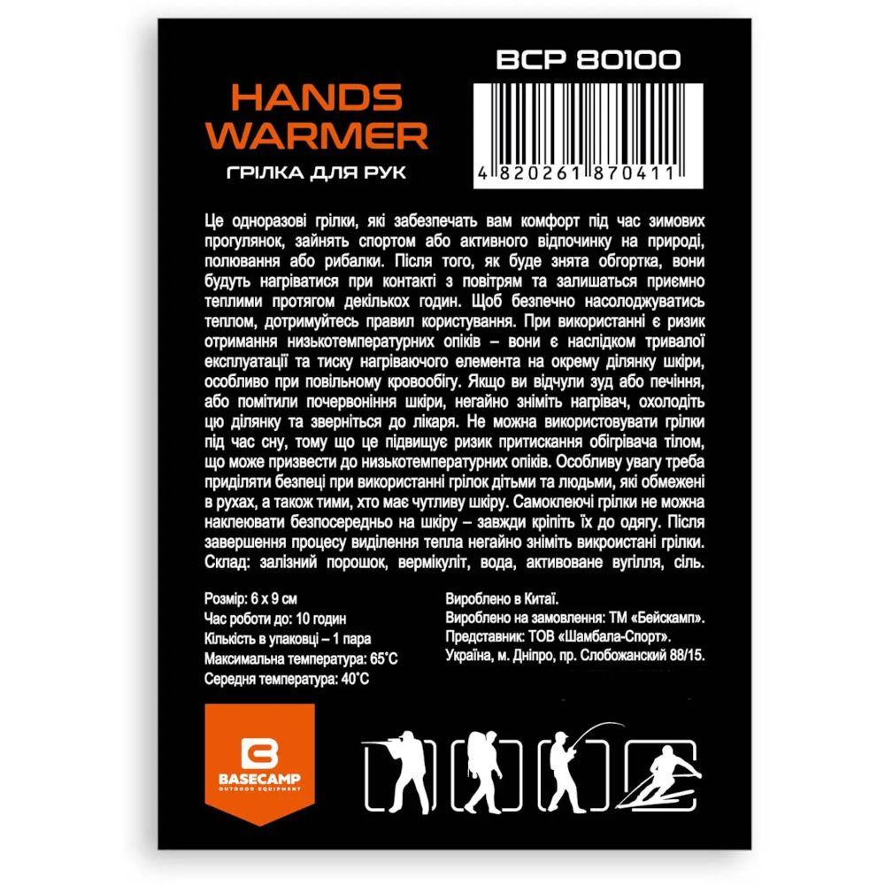 Хімічна грілка для рук BaseCamp Hand Warmer. Це одноразові грілки, які забезпечать вам комфорт під час зимових прогулянок, занять спортом або активного відпочинку на природі, полювання, рибалки. Після того, як буде знята обгортка, вони будуть нагріватися при контакті з повітрям та залишаться приємно теплими протягом декількох годин. Щоб безпечно насолоджуватись теплом, дотримуйтесь правил користування.