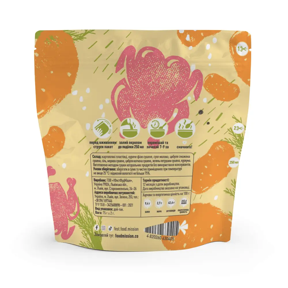 Склад: картопляні пластівці, куряче філе сушене, сухе молоко, цибуля смажена сушена, сіль, морква сушена, цибуля копчена сушена, зелень петрушки сушена, куркума.