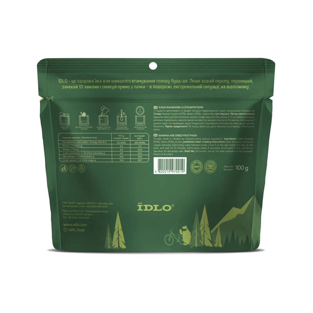 Потіш себе екзотикою. Адже такого тобі не запропонують навіть в “найбанановіших” республіках. Каша має неповторний смак, здатна швидко наситити дорослу людину і швидко відновити запас витрачених калорій. Що важливо: захопивши в гори бананову кашу ЇDLO, ти позбавиш себе необхідності нести і утилізувати всюдисущі жовті шкірки. “Органіка, - скажеш ти. “Перегниє,” - скаже твій корєш. Можливо, але врахуй, що в умовах вискогір’я будь-яке органічне сміття розкладається значно довше. І воно все одно залишається сміттям. Тож команда ЇDLO буде лише вдячна тобі, що допомагаєш нам дбати про природу і довкілля.