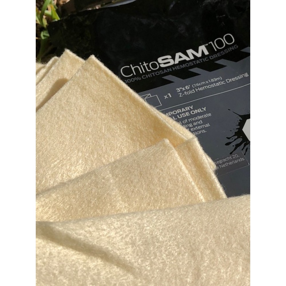 ChitoSAM™ 100 - це високоефективний кровоспинний нетканий хітозановий перев'язувальний матеріал, виготовлений безпосередньо з хітозану, отриманого з панцирів ракоподібних або снігового краба.
