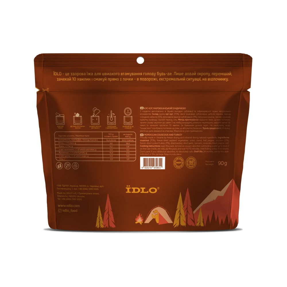 Склад: крупа кус-кус (70%), овочі тушковані сублімовані: цибуля, морква, перець солодкий, кабачок (13%), філе індиче варене сублімоване (11%), петрушка сушена, часник сушений, куркума, коріандр, чорний перець, сіль.