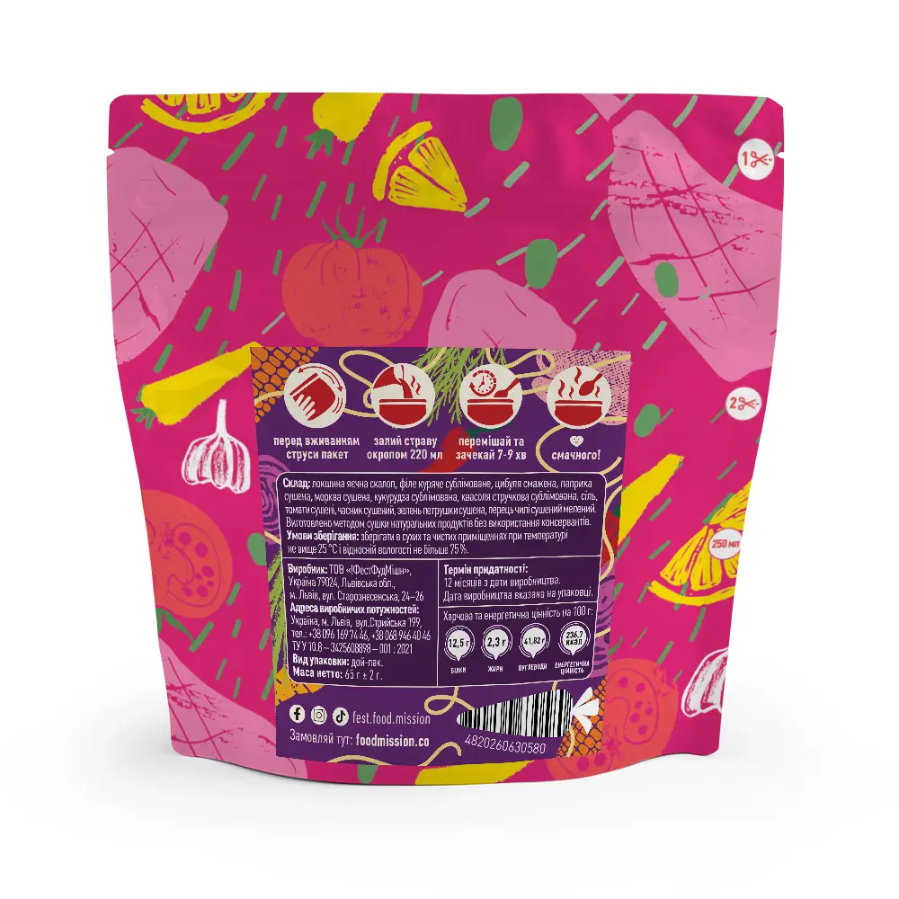 Спосіб приготування: перед вживанням струсити пакет, відкрити та залити страву окропом до поділки 220 мл, ретельно перемішати, закрити замок на пакеті та зачекати протягом 7-9 хвилин.