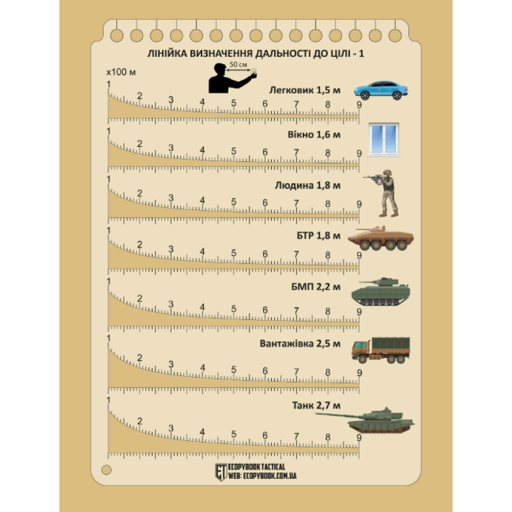 Незважаючи на технологічний прогрес армія США до сих пір використовує схожі лінійки, незважаючи на наявність лазерних далекомірів. ЛВДЦ від ECOPYBOOK TACTICAL це простий компактний варіант для визначення дальності, який не потрібно заряджати, також лінійка не випромінює та не відблискує
