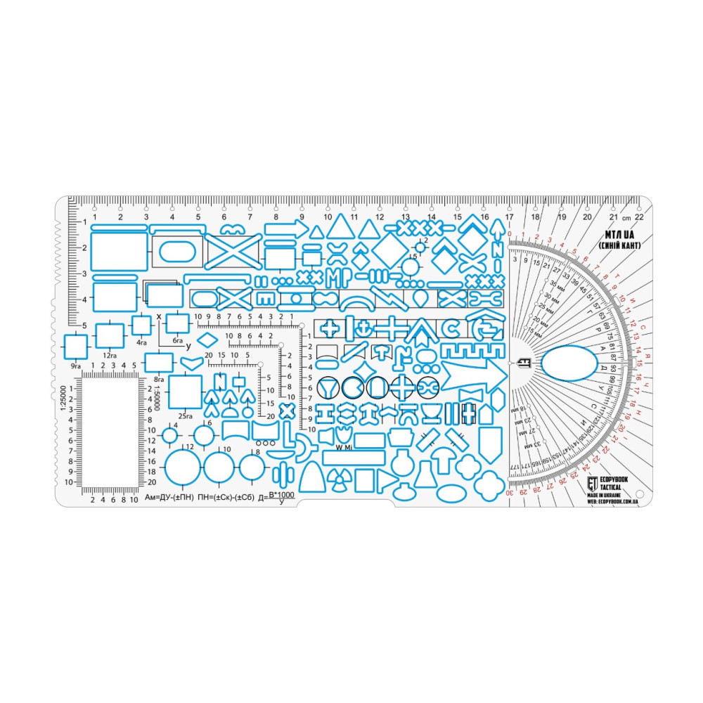 Мала тактична лінійка UA 232x120 (mm) (синій кант) - це компактний вимірювальний інструмент, створений для точних вимірювань, побудов і фіксації даних у польових і тактичних умовах. Вона поєднує зручність невеликого формату з міцною та функціональною конструкцією, що робить її корисною як для щоденної роботи, так і для професійного використання.