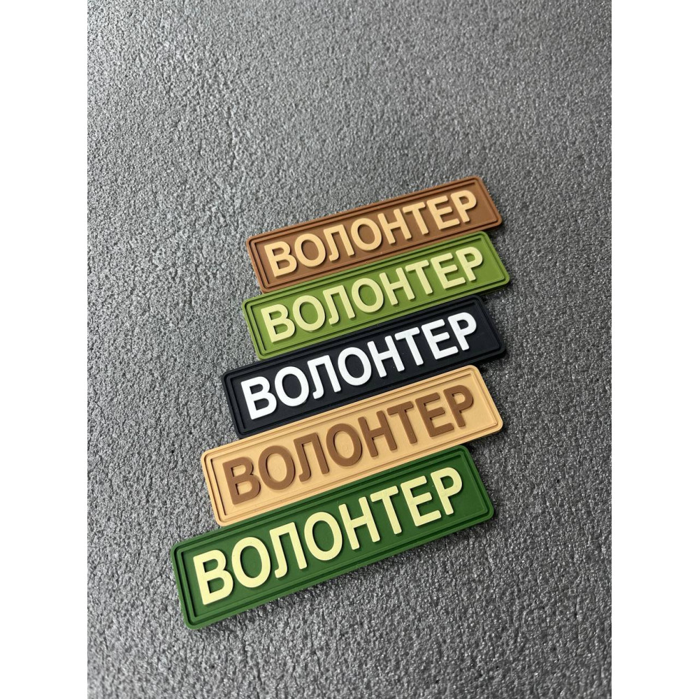 "Волонтер"Виготовлено за технологією Laser Cut, що полягає в тому, що отвори прорізаються в матеріалі лазером, дозволяючи домогтися чітких ліній, рівних країв, що не обтріпуються, і наносити складні зображення і написи. Між шаром кардури і липучкою велкро, яка є зворотною стороною нашивки, вклеєний прогумований матеріал необхідних кольорів що дозволяє створити другий план, що відрізняється за кольором.