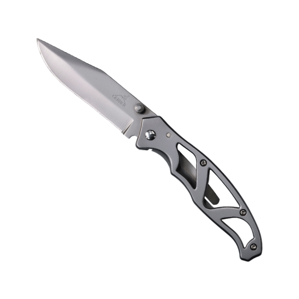 Складаний кишеньковий ніж Gerber Paraframe i 22-48443 має стандартний для серії Paraframe дизайн – «каркасна» рукоятка сіро-сталевого кольору і лезо кольору «хром». І рукоятка, і лезо ножа створені з нержавіючої сталі. Заточка клинка-пряма і серрейторная, що розширює можливості леза. З такою заточуванням зручно розрізати Мотузки, канати і схожі матеріали. Ніж функціональний і безпечний – лезо розкривається однією рукою, а надійний фіксатор не дає йому закритися в невідповідний момент.