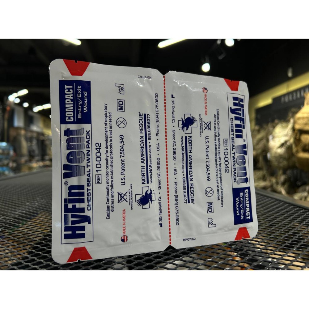 HyFin® Vent Chest Seal Twin Pack від North American Rescue - встановлює стандарт для профілактики, лікування та контролю відкритого та/або напруженого пневмотораксу, що може бути спричинений проникаючою травмою грудної клітки. Два ущільнювачі, кожен в індивідуальній упаковці, розроблені таким чином, щоб користувач міг накласти ущільнювач як на вхідну, так і на вихідну рану, а також мати можливість накласти тільки один, а інший зберігати до тих пір, поки не знадобиться, залежно від ситуації. Ця інноваційна конструкція має 3-вентильовані канали, призначені для запобігання потраплянню повітря в грудну порожнину під час вдиху, дозволяючи повітрю виходити через вентиляційні канали під час видиху. Канали з 3 вентиляційними отворами призначені для відведення крові, навіть якщо два з трьох каналів заблоковані, вентиляційний отвір залишається повністю функціональним.