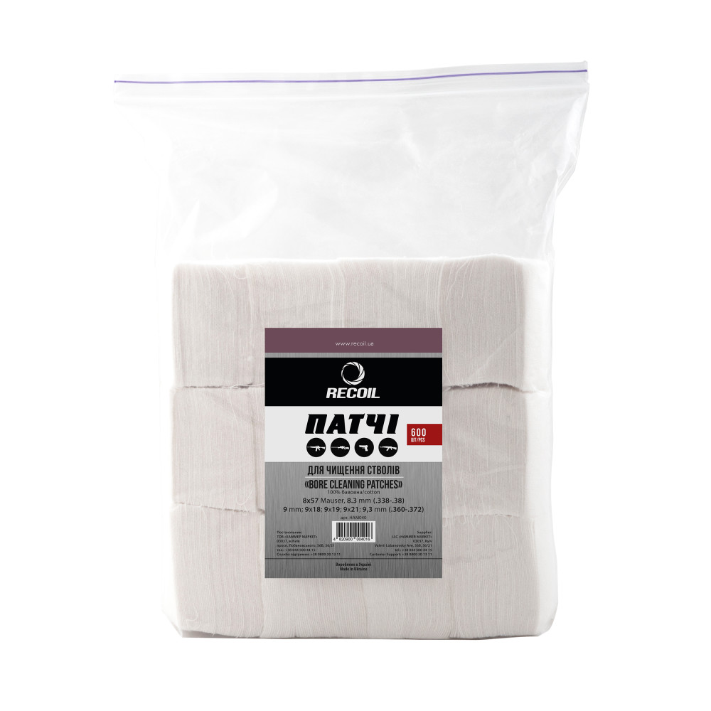 Призначений для чищення стволів калібру 8X57 Mauser, 8.3, 9, 9X18, 9X19, 9X21, 9.3мм. Патчі від торгової марки Recoil виготовлені в Україні із високоякісної бавовни. Дозволяють швидко і надійно очистити ствол практично будь-якої стрілецької зброї, представленої на ринку.