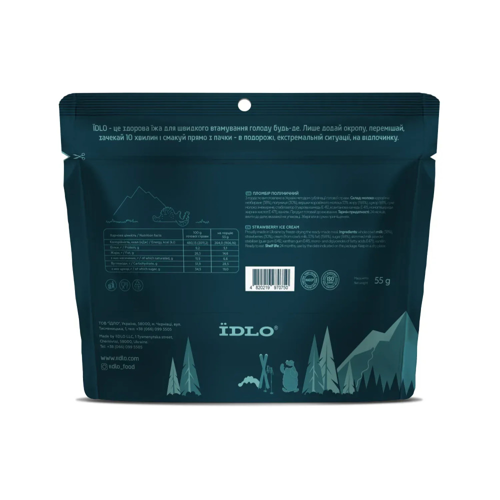 Склад: молоко коровʼяче незбиране (38%), полуниця (30%), вершки коровʼячого молока 33% жиру (19,8%), цукор (9,8%), сухе молоко знежирене, стабілізатор (гуарова камедь Е 412, ксантанова камедь Е 415, моногліцериди жирних кислот Е 471), ванілін.