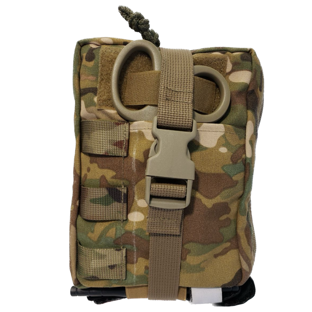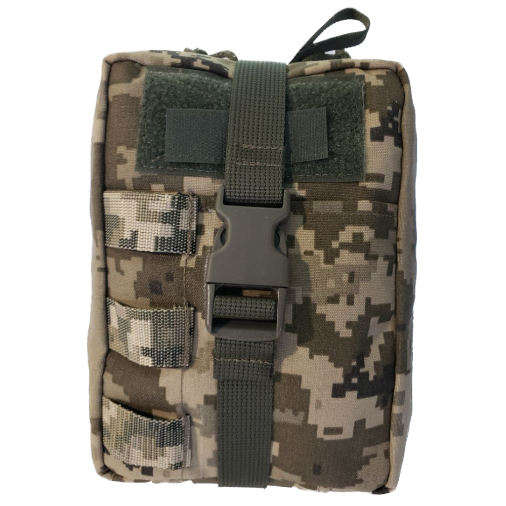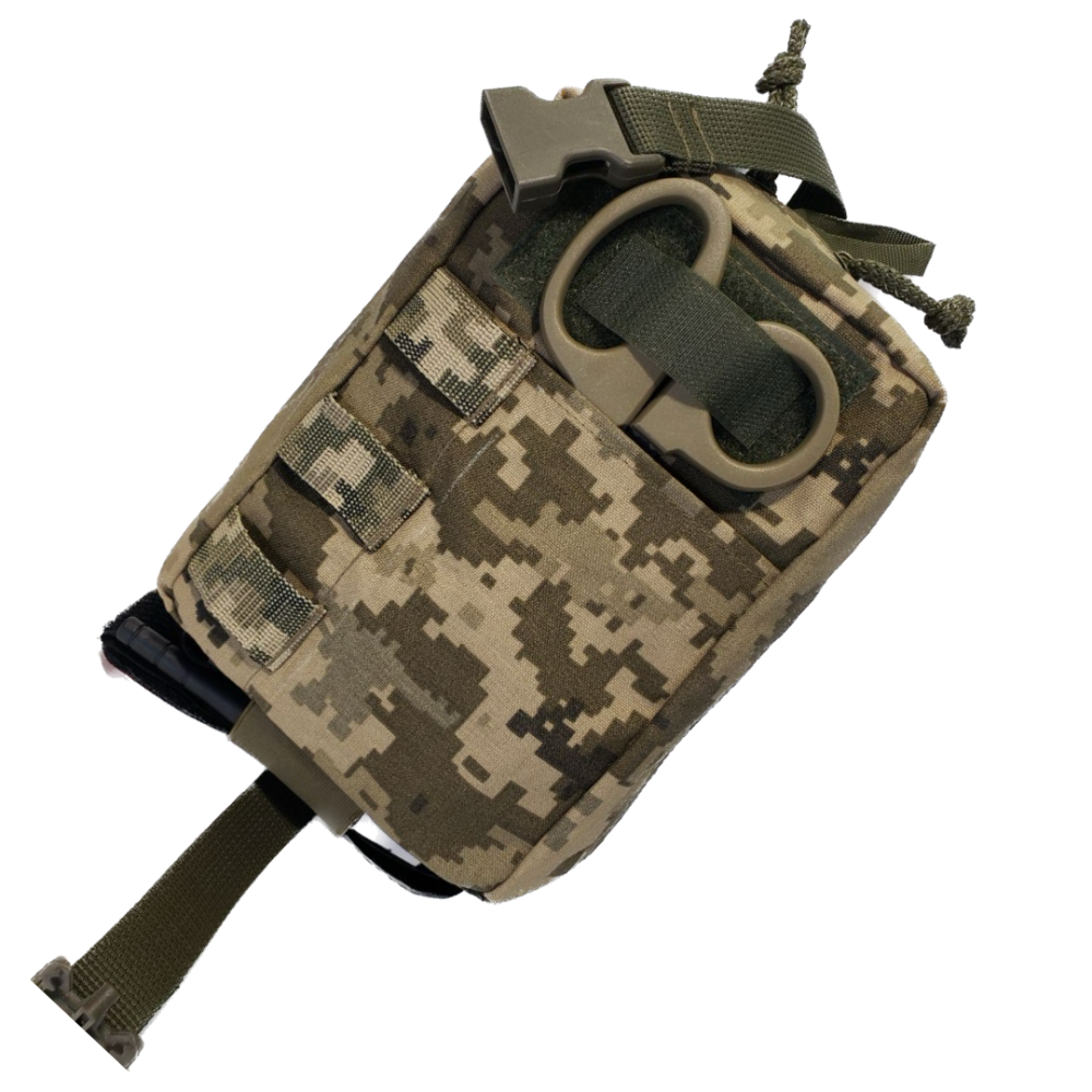 Підсумок має прямокутну вертикальну форму з додатковою кишенею на лицьовій частині та кріплення для ножиць. На тильній стороні розташована система швидкого скидання підсумка на липучці Velcro, яка додатково закріплює підсумок завдяки невеликому нейлоновому фастексу на передній частині. Зверху вшита стропа для ручного транспортування підсумку, а всередині передбачено дві великі різнорівневі кишені та комірки з плоскої та круглої гумки для фіксації всіх необхідних мед. приладдя. Швидке і повне відкриття підсумку на 180 градусів проводиться шляхом розстібування двосторонньої блискавки, в результаті чого під рукою виявляється весь вміст аптечки. Знизу підсумка додаткова розташована гума для кріплення турнікету