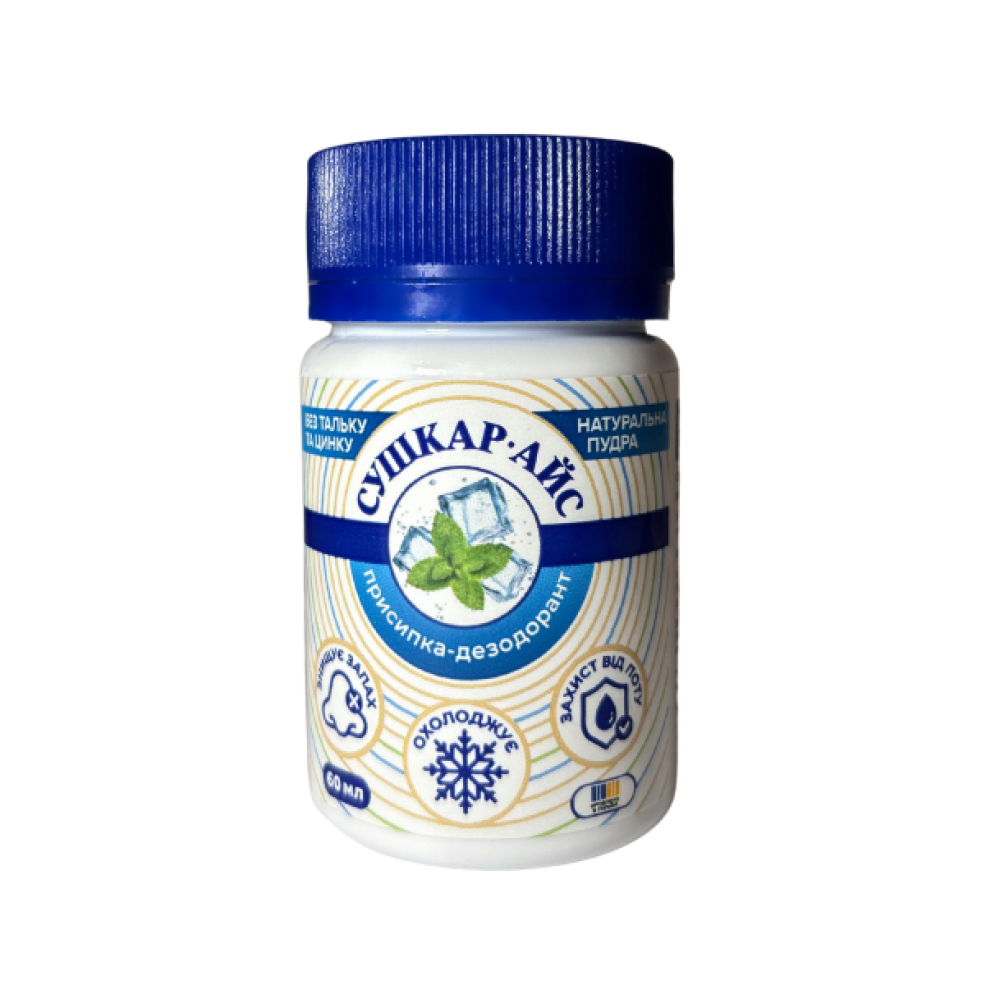 СУШКАР АЙС - натуральна мінеральна присипка для ніг, шкарпеток та взуття з освіжаючим ефектом.