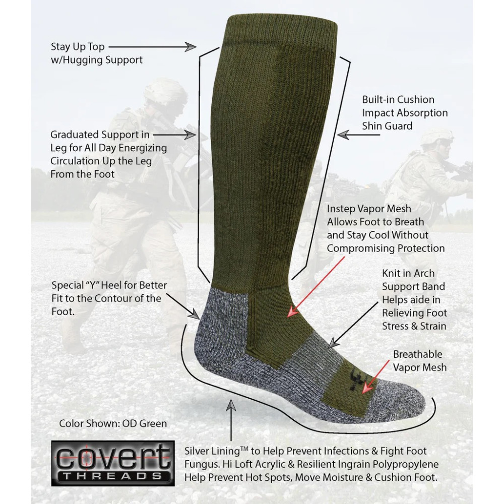 Військовий Hi-Speed носок спеціально розроблений для пересічної місцевості. Зокрема для довгих умов та важких навантажень, зберігає свою форму незважаючи на багатокілометрові кількаденні рейди, а також надає підтримку активізації м'язів. Висока стійкість подушки на шкарпетці у конкретних зонах удару, допомагає усунути їх наслідки, при ударі ніг об тверді поверхні. Silver Lining бореться із бактеріями протягом усього дня, щодня.
