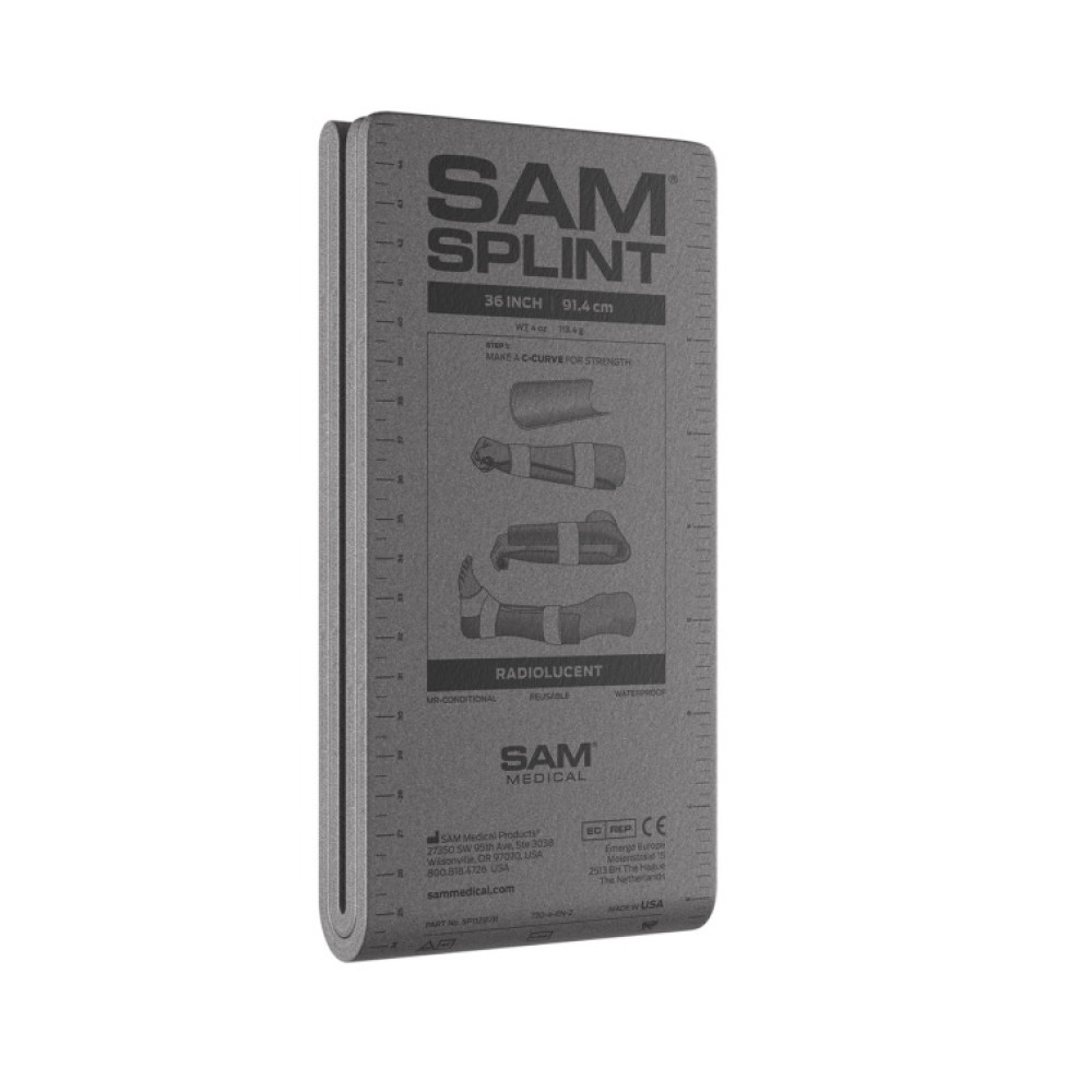 Виріб виготовлений з алюмінію та пінопласту. Шина складана SAM Splint часто використовується при розтягуваннях, вивихах та переломах. З її допомогою можна легко знерухомити пошкоджену ділянку тіла.