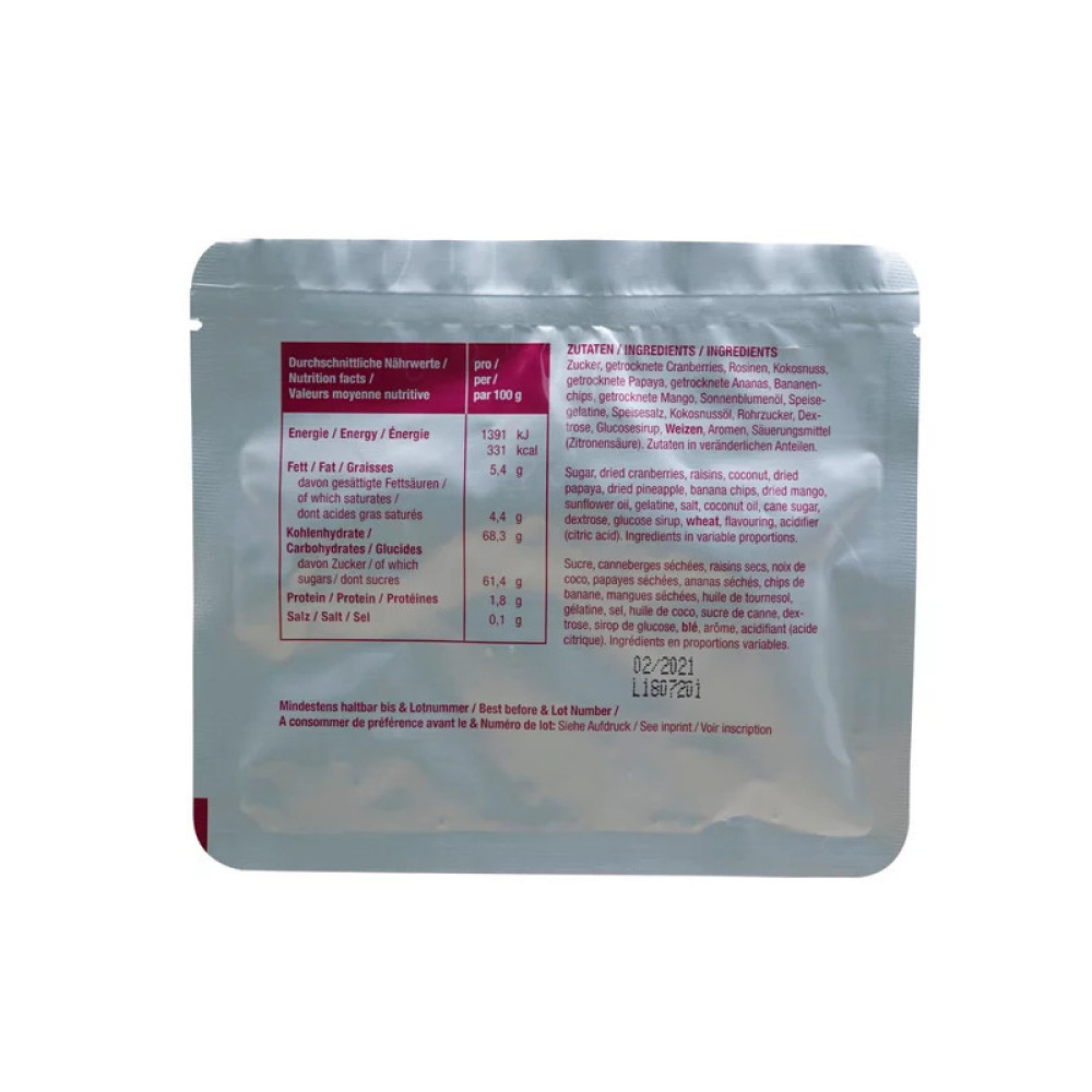 Склад: цукор, сухофрукти у змінній пропорції (журавлина, родзинки, кокос, папая, ананас, бананові чипси, манго), соняшникова олія, желатин, сіль, кокосова олія, тростинний цукор, декстроза, сироп глюкози, пшениця, натуральний ароматизатор, підкислювач (лимонна кислота)