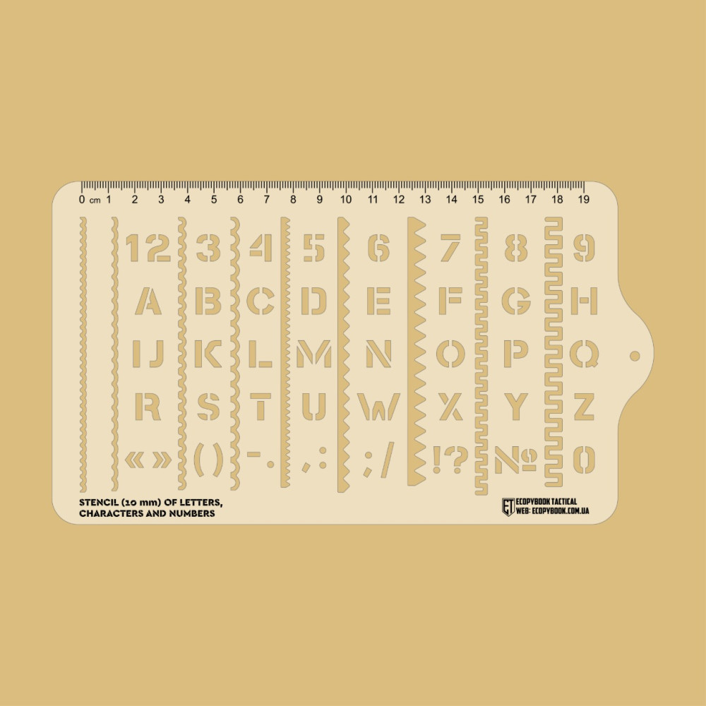 Трафарет виготовлений із міцного матеріалу, стійкого до багаторазового використання, і підходить як для польових завдань, так і для робочого столу, майстерні або навчальних занять. Він ідеально підходить для створення маркування на блокнотах, картах, планах, спорядженні чи будь-якому іншому матеріалі, де важлива чітка та акуратна розмітка.