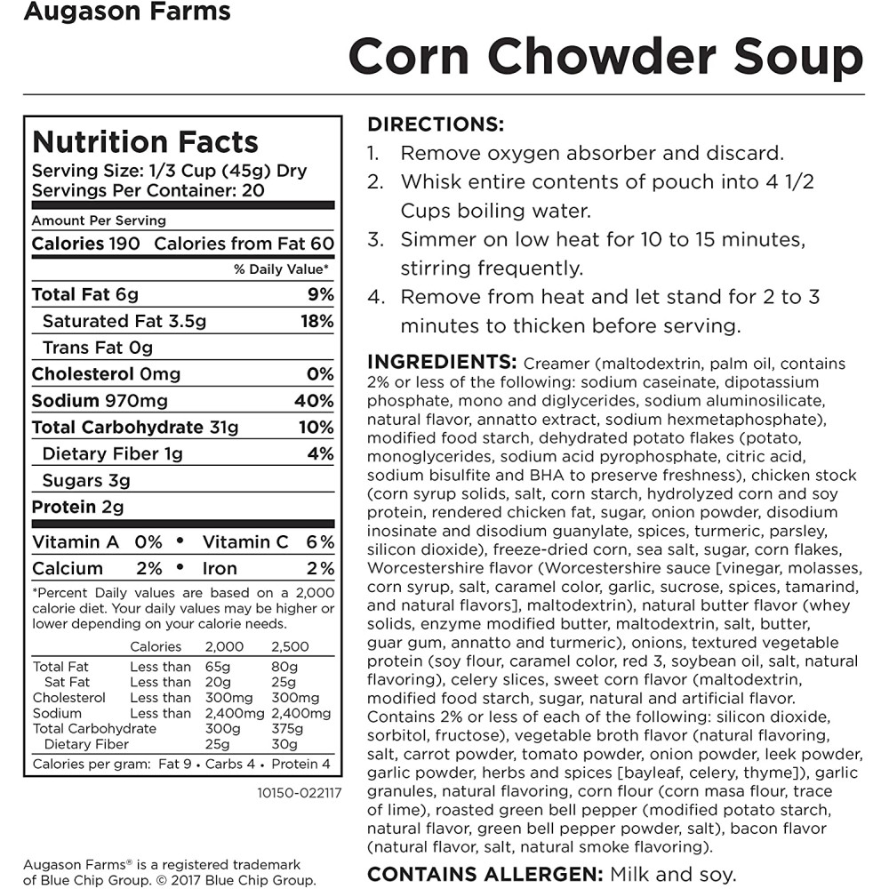 Кукурудзяний суп від Augason Farm незамінний для приготування ситного, корисного супу для повсякденного їди. Густа і кремоподібна кукурудзяна юшка - ідеальна енергетична їжа, ідеальне рішення в екстрених випадках або як повсякденний прийом їжі. Цей смачний зневоднений суп простий у приготуванні та поживний, а завдяки тривалому терміну зберігання пропонує вашій родині зручне рішення у приготуванні страв.