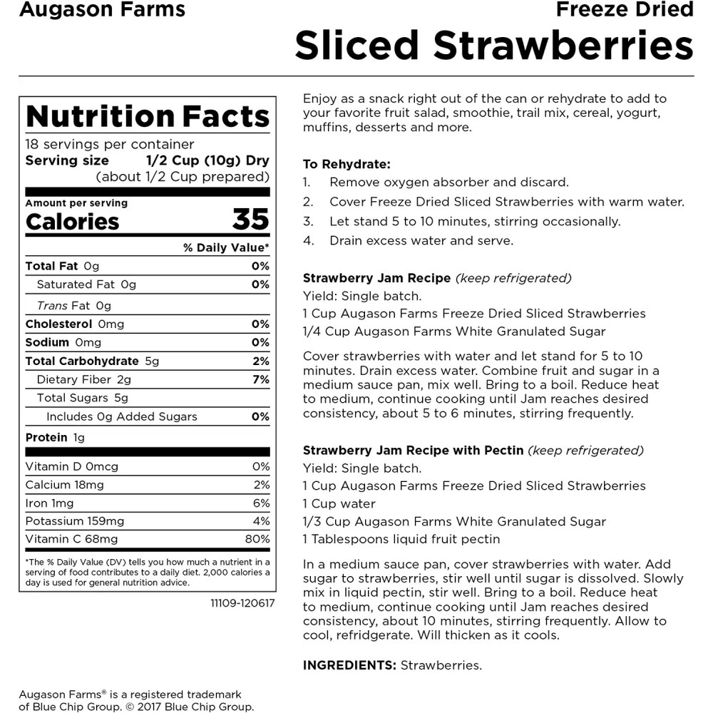 Нарізана полулімована полуниця багата на вітамін С, і її можна їсти щодня як закуску або як добавку до холодних пластівців або вівсянки, щоб додати трохи натуральної солодощі. Ви також можете відновити їх з невеликою кількістю води і додати у свій полуничний бісквіт, полуничний молочний коктейль або полуничний торт. Також є чудовим доповненням до мюслі. Термін зберігання у закритому вигляді до 30 років, рецептура на етикетці банки.
