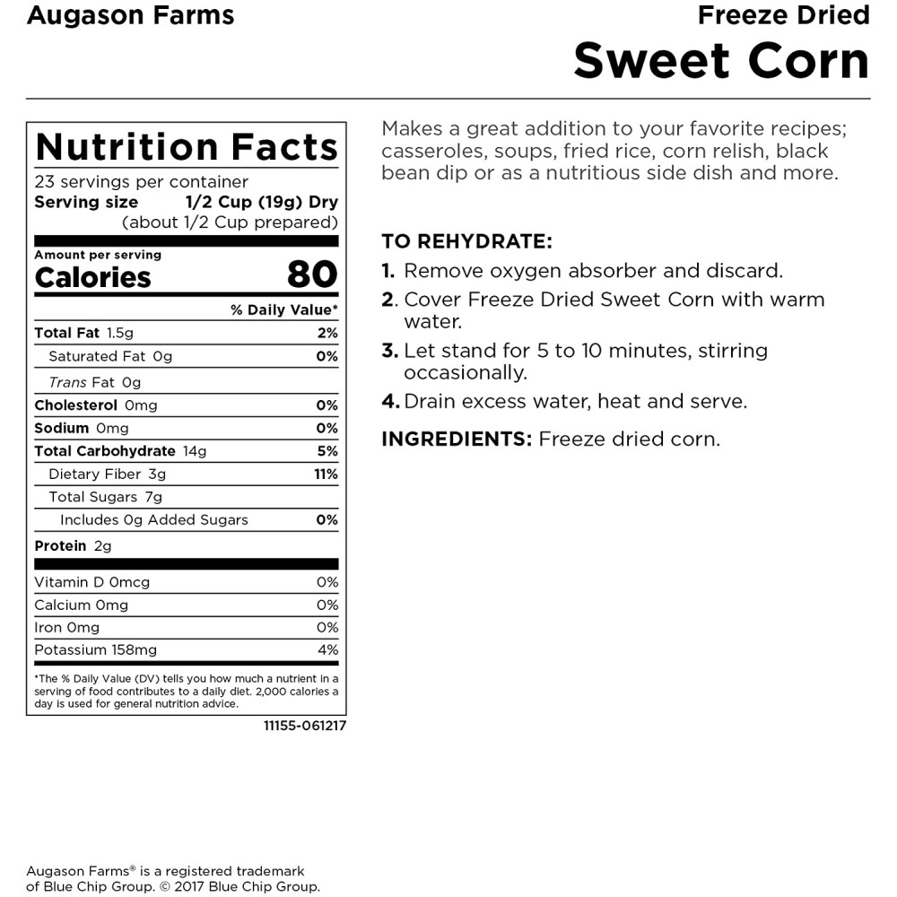 Сублімована солодка кукурудза у запасі продуктів харчування на випадок надзвичайної ситуації дає вам ряд можливостей при приготуванні їжі. Його можна їсти прямо з банки (на смак він як попкорн!), використовувати як хрустку начинку для салатів або тако або навіть використовувати у вегетаріанських сумішах для походів або кемпінгу. Підходить для використання як гарнір або в таких рецептах, як супи, перець чилі, запіканки та багато іншого.